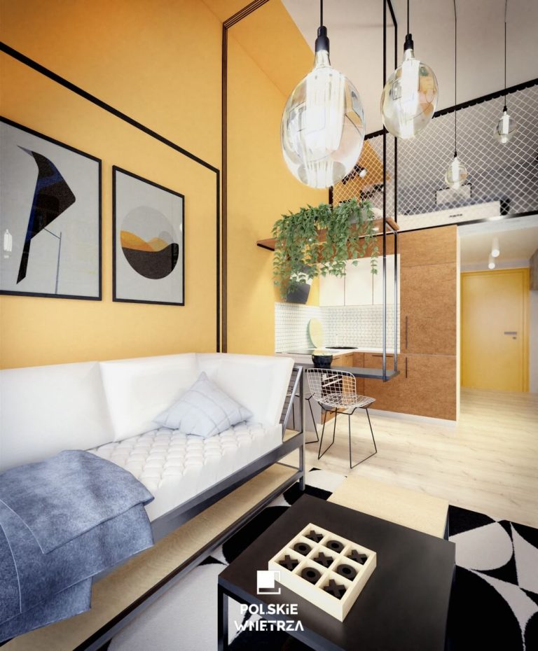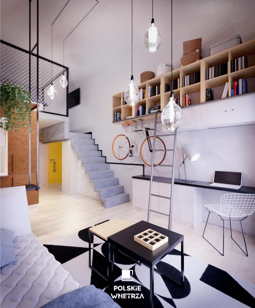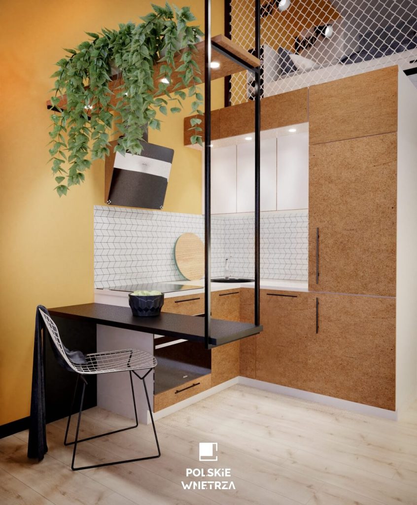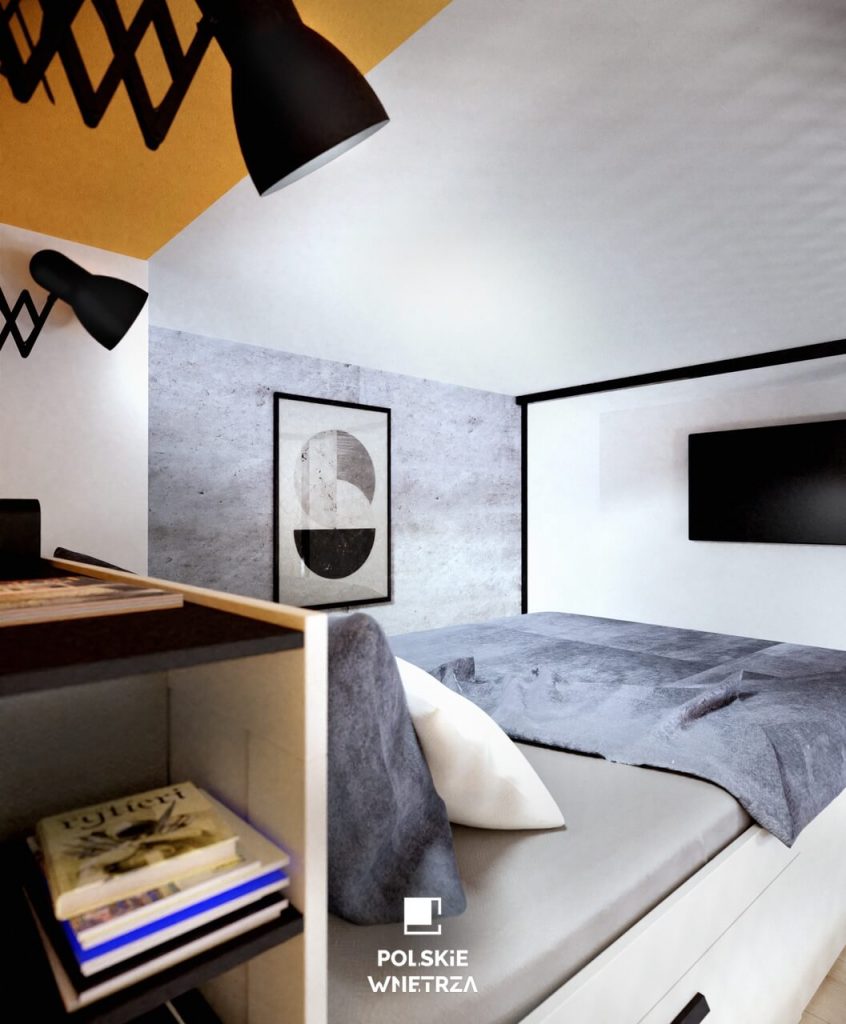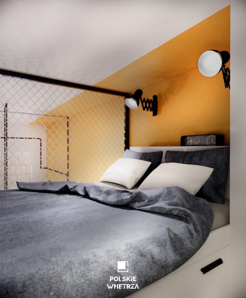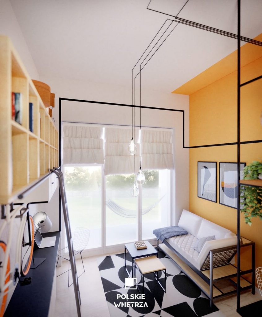 Niebanalne mieszkanie o powierzchni 25 m kw. z antresolą, zostało urządzone z myślą o uczącym się lub pracującym singlu, który żyje w biegu, a wracając do domu potrzebuje chwili relaksu. Przestrzeń w nieco młodzieżowym klimacie opiera się na graficznych akcentach w postaci linii, które współgrają z energicznymi i pobudzającymi kolorami.