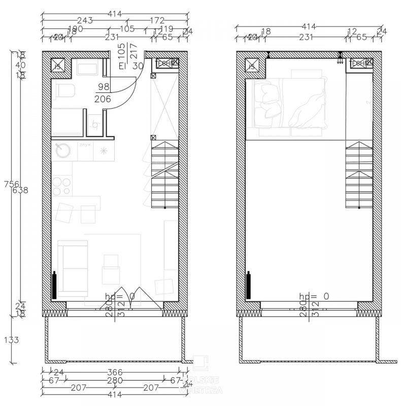 Projekt autorstwa studia Wojtyczka zakłada wykorzystanie jak największej możliwej przestrzeni do przechowywania, tym samym nie zabierając miejsca do wykonywania codziennych czynności. Mieszkanie zachowało również wszystkie potrzebne do funkcjonowania strefy. W dolnej części kawalerki znajduje się wydzielona kuchnia wraz z miejscem do spożywania posiłków, która posiada pełnowymiarową lodówkę, zmywarkę i piekarnik, strefa relaksu – miejsce do spotkań z przyjaciółmi oraz wydzielone miejsce do pracy przy komputerze. Na antresoli zaaranżowano sypialnię, w której również znajduje się kilka przydatnych schowków.