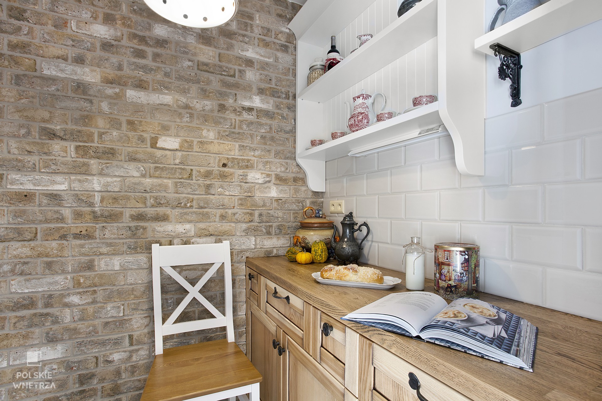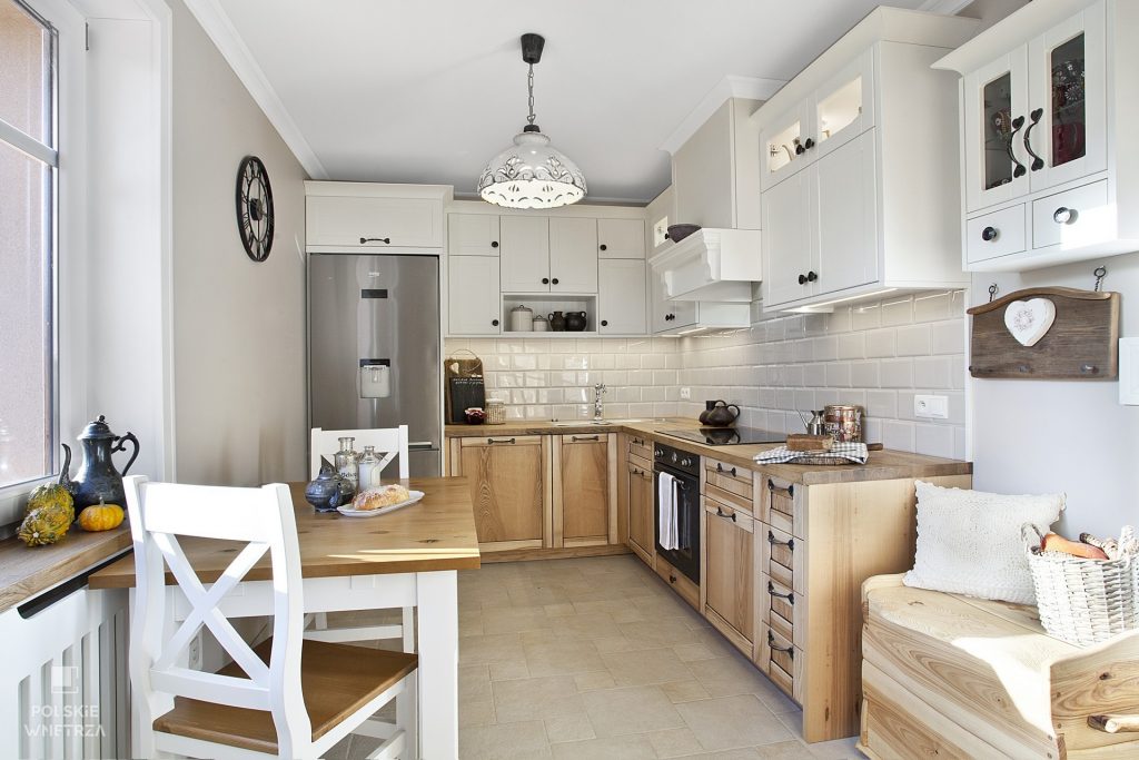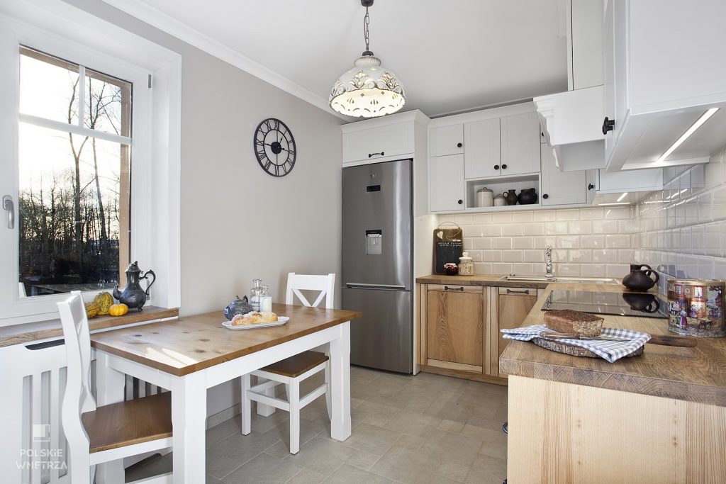 Wnętrze z lat 70-tych zostało poddane generalnej metamorfozie. Przed metamorfozą kuchnia sprawiała wrażenie małej i nieustawnej. Ciemne kolory i umeblowanie optycznie pomniejszały jej powierzchnię. W pomieszczeniu wprowadzono nowe meble, sprzęty i dodatki. Wybrano białe i drewniane fronty oraz dębowe blaty, które doskonale wpisują się w rustykalny klimat wnętrza. Umiejętne połączenie materiałów, kolorów i faktur dodało wnętrzu przestronności oraz pozwoliło stworzyć funkcjonalne i efektowne wnętrze.