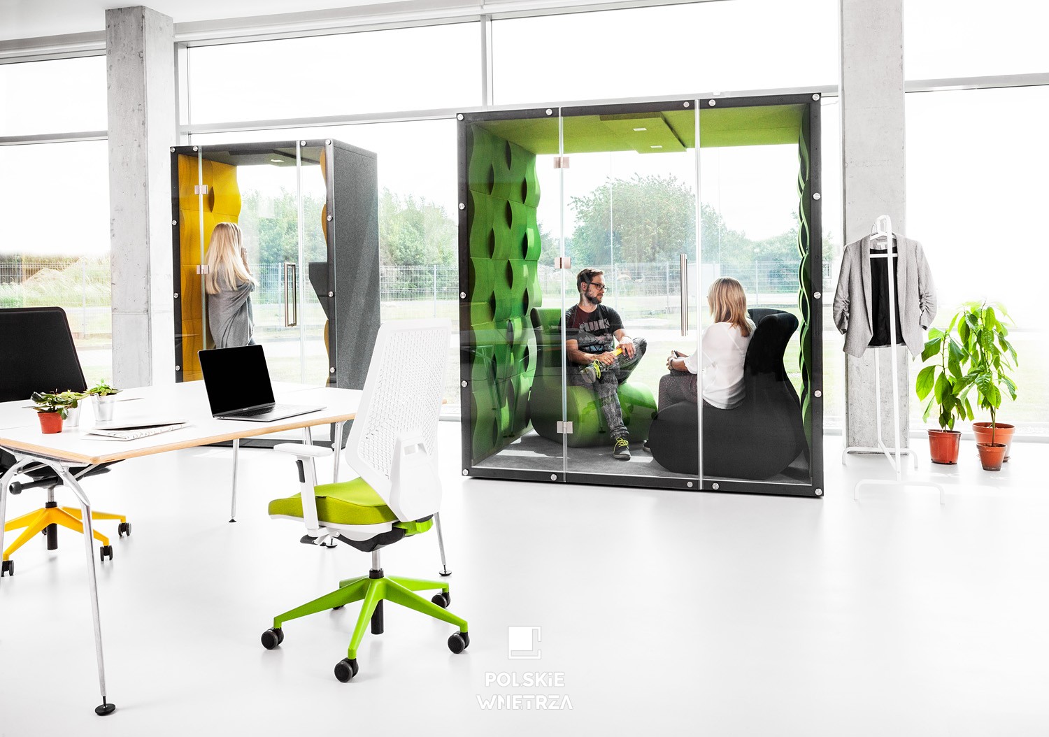 Wychodzą one tym samym naprzeciw nowym potrzebom: poszukiwania balansu pomiędzy pracą przy biurku, w zespole, a potrzebą ciszy, pracy solo czy w mniejszej grupie. Stanowią doskonałe uzupełnienie biurowych stref wsparcia, umożliwiających pracę w większym komforcie akustycznym.