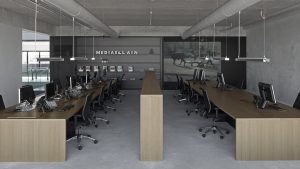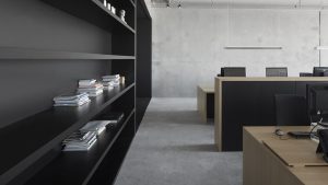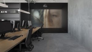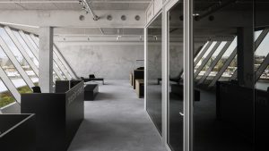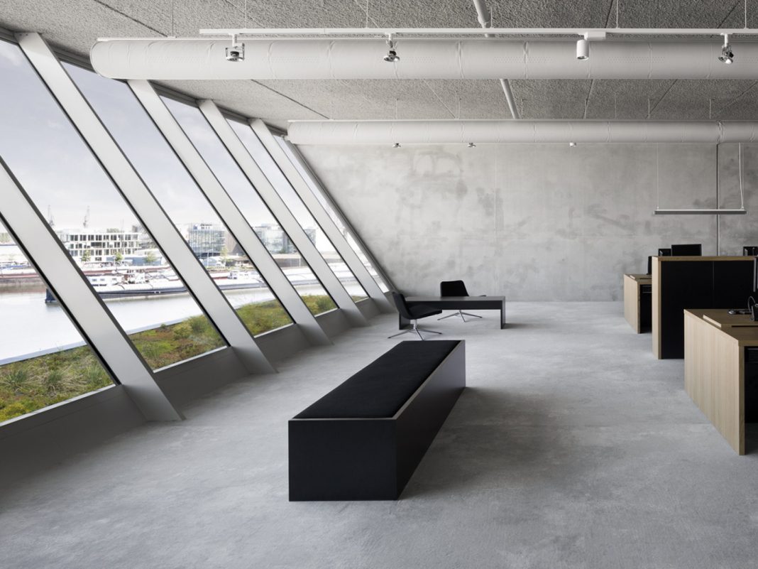 W salach typu open space zastosowano duże stoły wykonane z drewna (nieobrobionego dębu), z których pracownicy mają przepiękny widok na na port z przodu budynku. Pas biur, sale spotkań, strefa wydruku oraz spiżarni znajdują się z tyłu. Na całej szerokości budynku korytarz zakończono czarnymi ścian, sufit i podłogi łączą działy biurowe. Korytarz funkcjonuje jako ekran rzutnika do projekcji.
