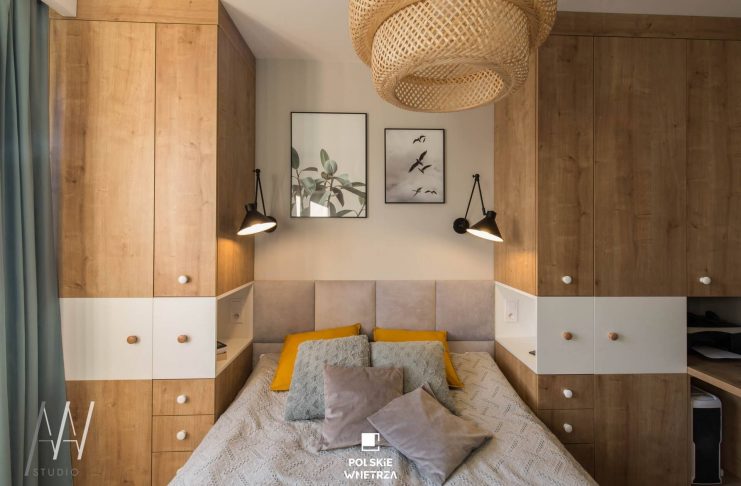 Przechodząc do następnego pomieszczenia – sypialni, warto zauważyć , że jest zaprojektowana w cieplejszej stylistyce, na czym zależało Inwestorom. Drewnianą zabudowę wokół łóżka przełamano białym pasem, a miętowe zasłony oraz tapicerowany zagłówek uzupełniają wnętrze. W pokoju w formie kontynuacji zabudowy garderobianej zaprojektowano także miejsce na komputer stacjonarny. W pokoju znalazła się także niewielka toaletka z miękkim taboretem. Na uwagę zasługuje kinkiet, który projektanci wymyślili jako element „zrób to sam”. Składa się on ze wspornika do półek, kolorowego kabla kupowanego na metry oraz oprawki i wtyczki. Całość można złożyć w 30 minut.