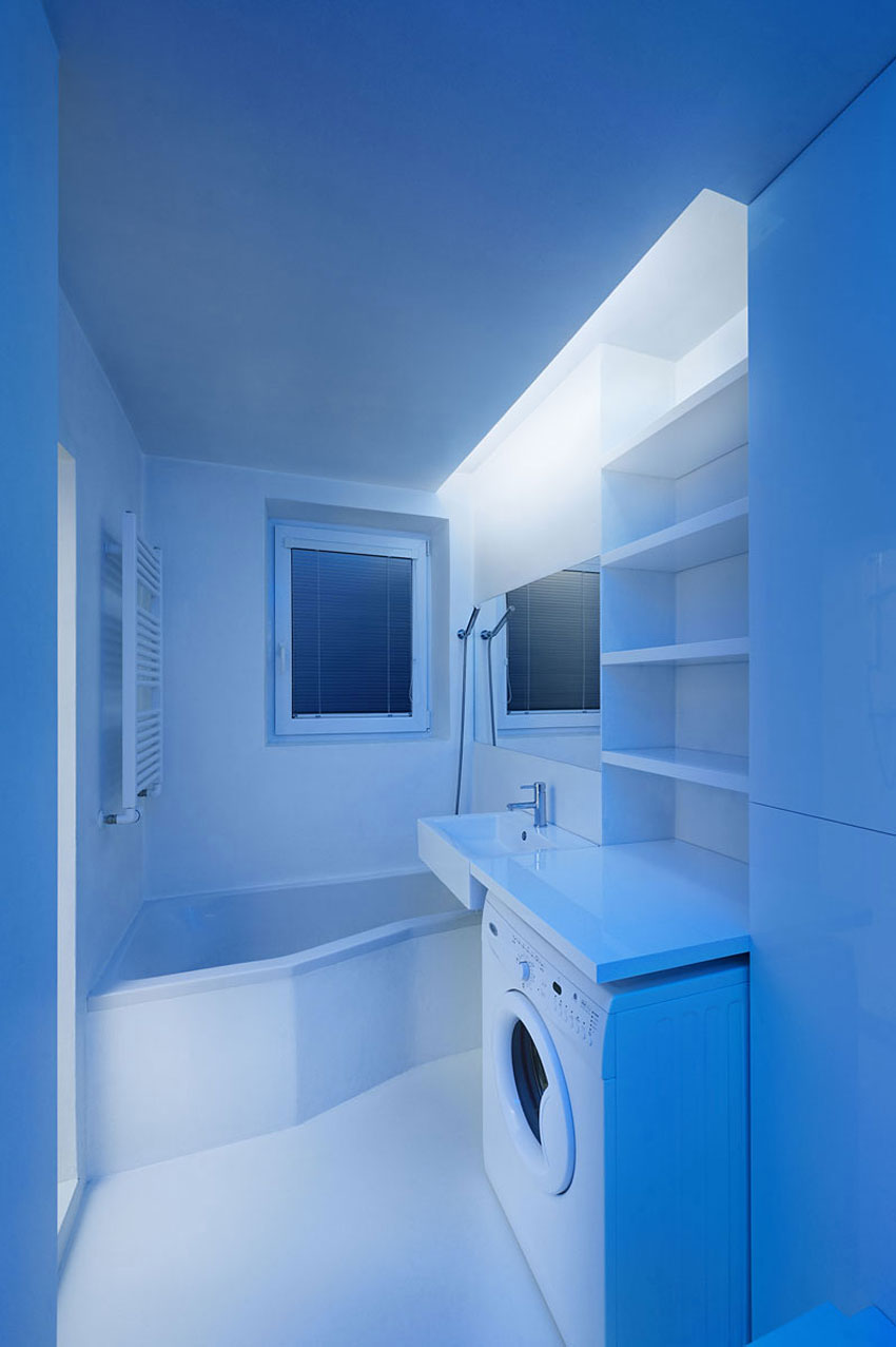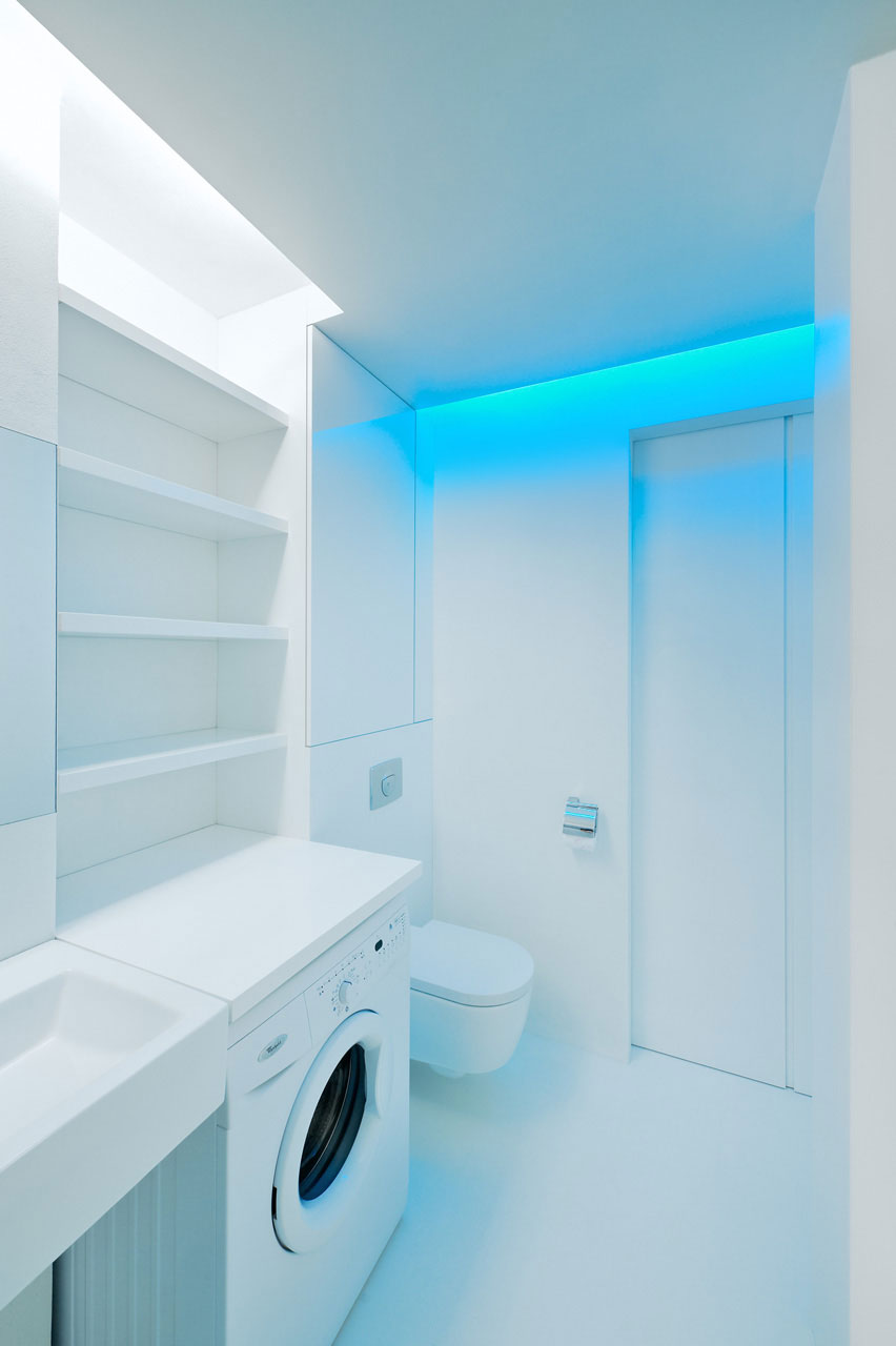 Efekt czystości uzyskano za pomocą białej farby matowej na ścianach i podłogach oraz meble polakierowane na wysoki połysk. Wszystko zostało odpowiednio oświetlone za pomocą diod LED, co dało niesamowity efekt.