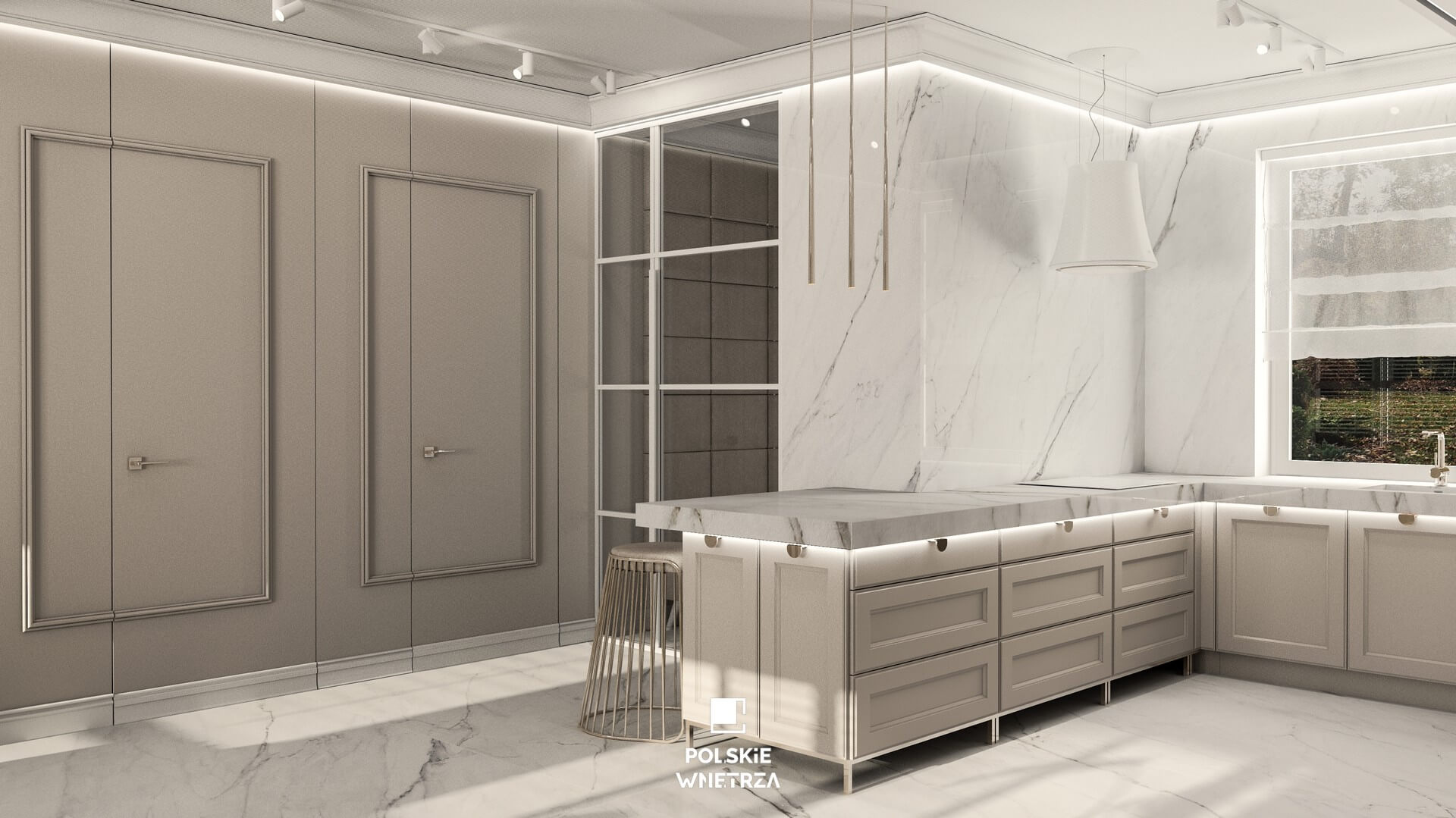 W kuchni króluje taupe. Ramiakowe fronty w tym kolorze, ozdabiają złote delikatne uchwyty. Całość dopełnia statuario zastosowany jako blat, okładzina ścian i podłóg. Pani Inwestor lubi wnętrza uporządkowan, stąd propozycja projektanta wysokich zabudów meblowych. Jest to fajna forma przechowywania wszystkiego, co jest potrzebne w kuchni, od produktów spożywczych, po ceramikę, garnki i szkło. Wysoka zabudowa kuchenna mieści w sobie również niezbędne sprzęty AGD, bez których ani rusz i pełni jeszcze inną fantastyczną rolę, Dzięki zastosowaniu systemu hawa concepta ukrywa dodatkowy blat roboczy. W tak przestronnej kuchni nie mogło zabraknąć miejsca na małą poranną kawkę a siedziska barowe to przykuwający uwagę smaczek całej kuchni.