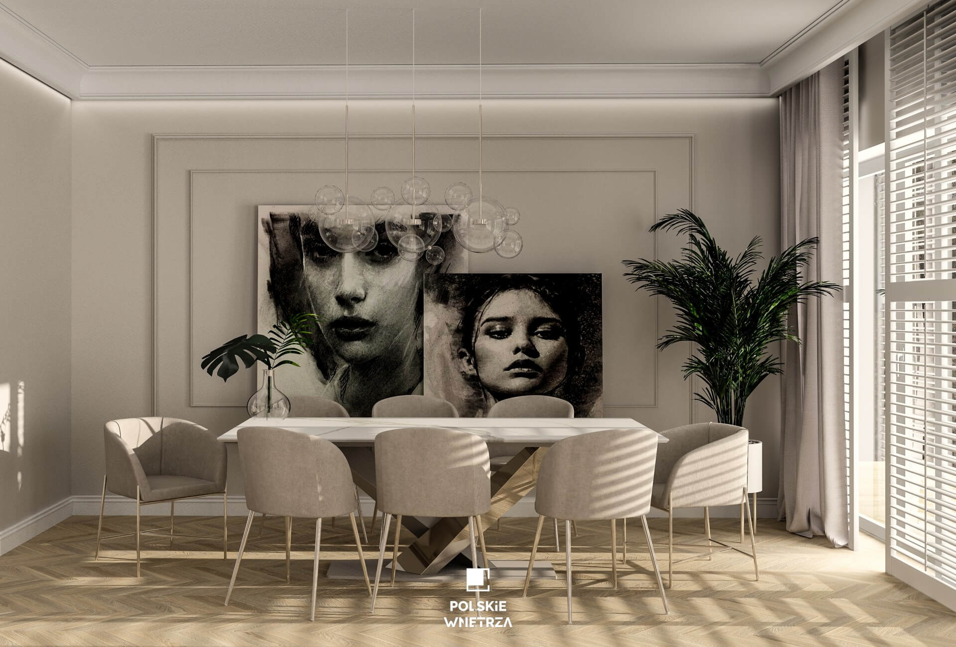 Dzięki olbrzymim witrynom, wnętrze jest bardzo jasne, a przed słońcem osłaniają shuttersy i zasłony, które pełnią również rolę dekoracyjną. Całość dosmaczają obłędne obrazy w dużm formacie.