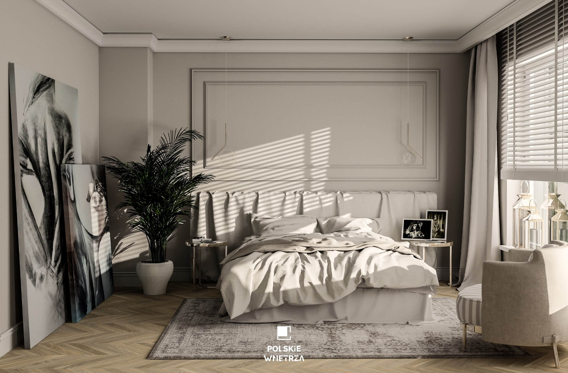 Sypialnia i łazienka dopełniają całość, urządzone są w tym samym stylu i kolorystyce, co przestrzeń dzienna, zachęcają do relaksu i wypoczynku. I tu nie zabrakło naturalnej drewnianej podłogi, ścian wykończonych statuario i miękkich tkanin. W łazience króluje duża wolnostojąca wanna a w sypialni olbrzymie wygodne łoże. Złote dodatki i sztukateria sprawiają, że całość wygląda niezwykle elegancko i szykownie. A olbrzymie obrazy, których i tu nie mogło zabraknąć, dodają charakteru i ukazują artystyczną duszę Pani Inwestor.